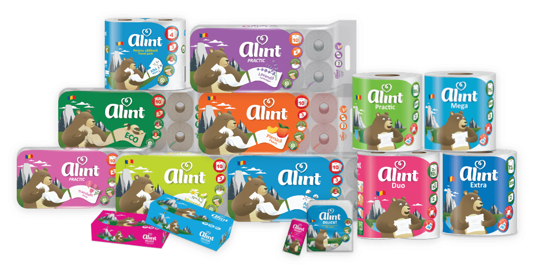 Hârtia Alint este moale, delicată și prietenoasă cu pielea. Disponibilă în variante parfumate sau neparfumate, în culori albe sau colorate, oferă opțiuni cu un număr variat de role în ambalaj.