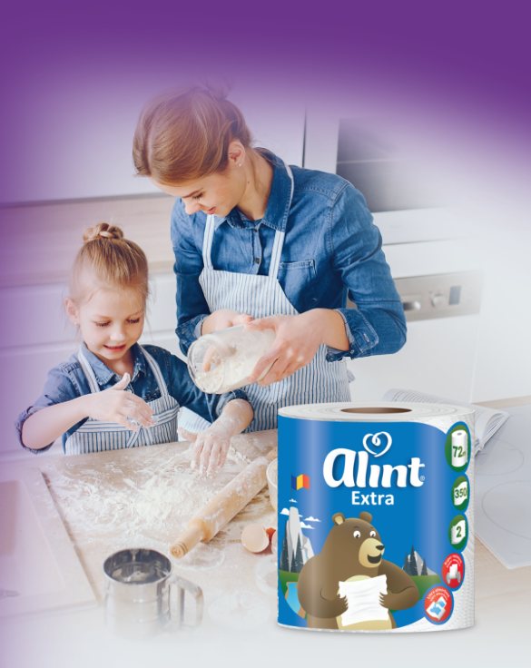 Hârtia Alint este moale, delicată și prietenoasă cu pielea. Disponibilă în variante parfumate sau neparfumate, în culori albe sau colorate, oferă opțiuni cu un număr variat de role în ambalaj.